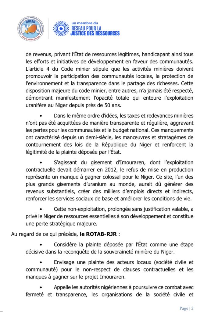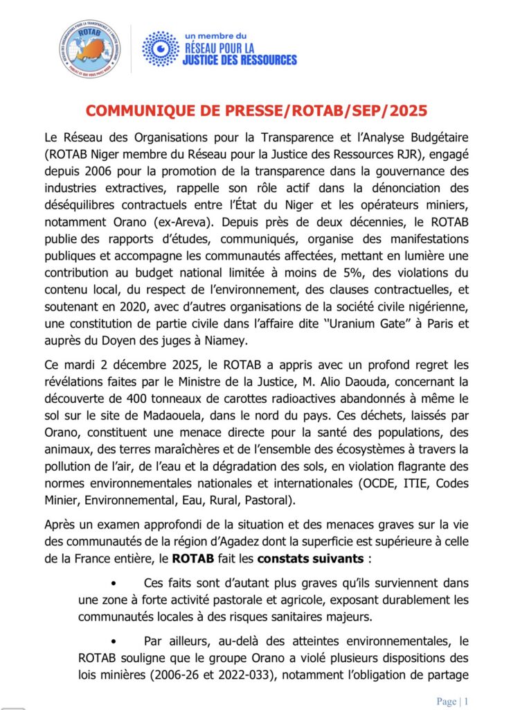 Le Réseau des Organisations pour la Transparence et l’Analyse Budgétaire (ROTAB Niger membre du Réseau pour la Justice des Ressources RJR), engagé depuis 2006 pour la promotion de la transparence dans la gouvernance des industries extractives, rappelle son rôle actif dans la dénonciation des déséquilibres contractuels entre l’État du Niger et les opérateurs miniers, notamment Orano (ex-Areva). Depuis près de deux décennies, le ROTAB publie des rapports d’études, communiqués, organise des manifestations publiques et accompagne les communautés affectées, mettant en lumière une contribution au budget national limitée à moins de 5%, des violations du contenu local, du respect de l’environnement, des clauses contractuelles, et soutenant en 2020, avec d’autres organisations de la société civile nigérienne, une constitution de partie civile dans l’affaire dite ‘’Uranium Gate’’ à Paris et auprès du Doyen des juges à Niamey.