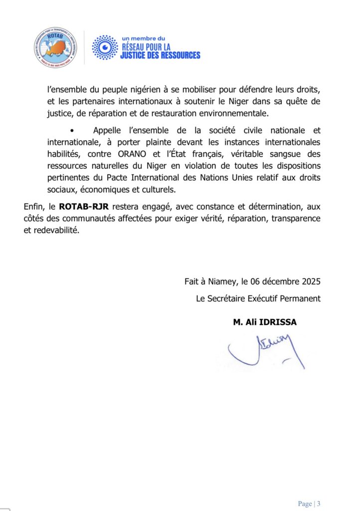 ​•​Appelle les autorités nigériennes à poursuivre ce combat avec fermeté et transparence, les organisations de la société civile et l’ensemble du peuple nigérien à se mobiliser pour défendre leurs droits, et les partenaires internationaux à soutenir le Niger dans sa quête de justice, de réparation et de restauration environnementale.