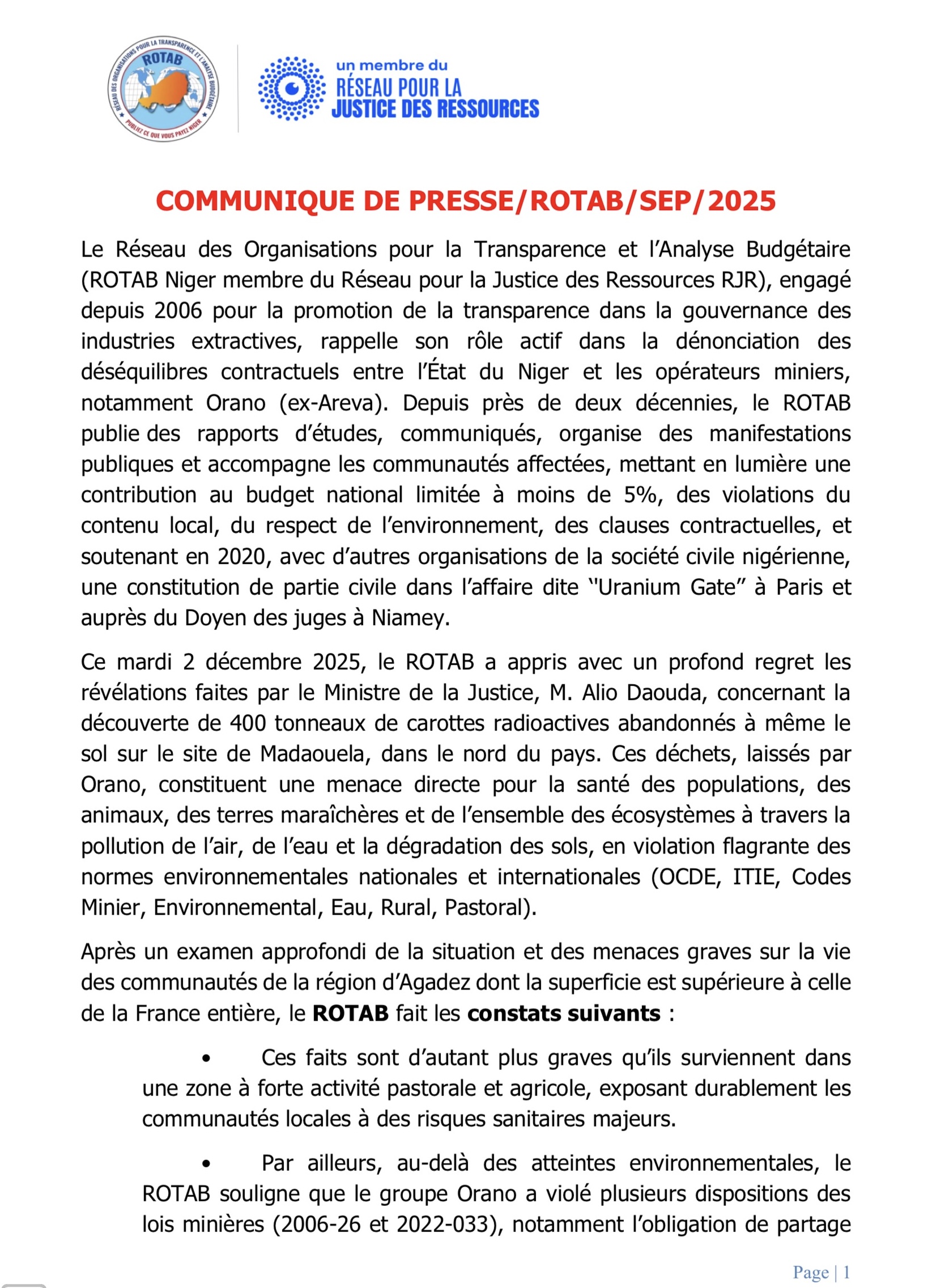 Le Réseau des Organisations pour la Transparence et l’Analyse Budgétaire (ROTAB Niger membre du Réseau pour la Justice des Ressources RJR), engagé depuis 2006 pour la promotion de la transparence dans la gouvernance des industries extractives, rappelle son rôle actif dans la dénonciation des déséquilibres contractuels entre l’État du Niger et les opérateurs miniers, notamment Orano (ex-Areva). Depuis près de deux décennies, le ROTAB publie des rapports d’études, communiqués, organise des manifestations publiques et accompagne les communautés affectées, mettant en lumière une contribution au budget national limitée à moins de 5%, des violations du contenu local, du respect de l’environnement, des clauses contractuelles, et soutenant en 2020, avec d’autres organisations de la société civile nigérienne, une constitution de partie civile dans l’affaire dite ‘’Uranium Gate’’ à Paris et auprès du Doyen des juges à Niamey.