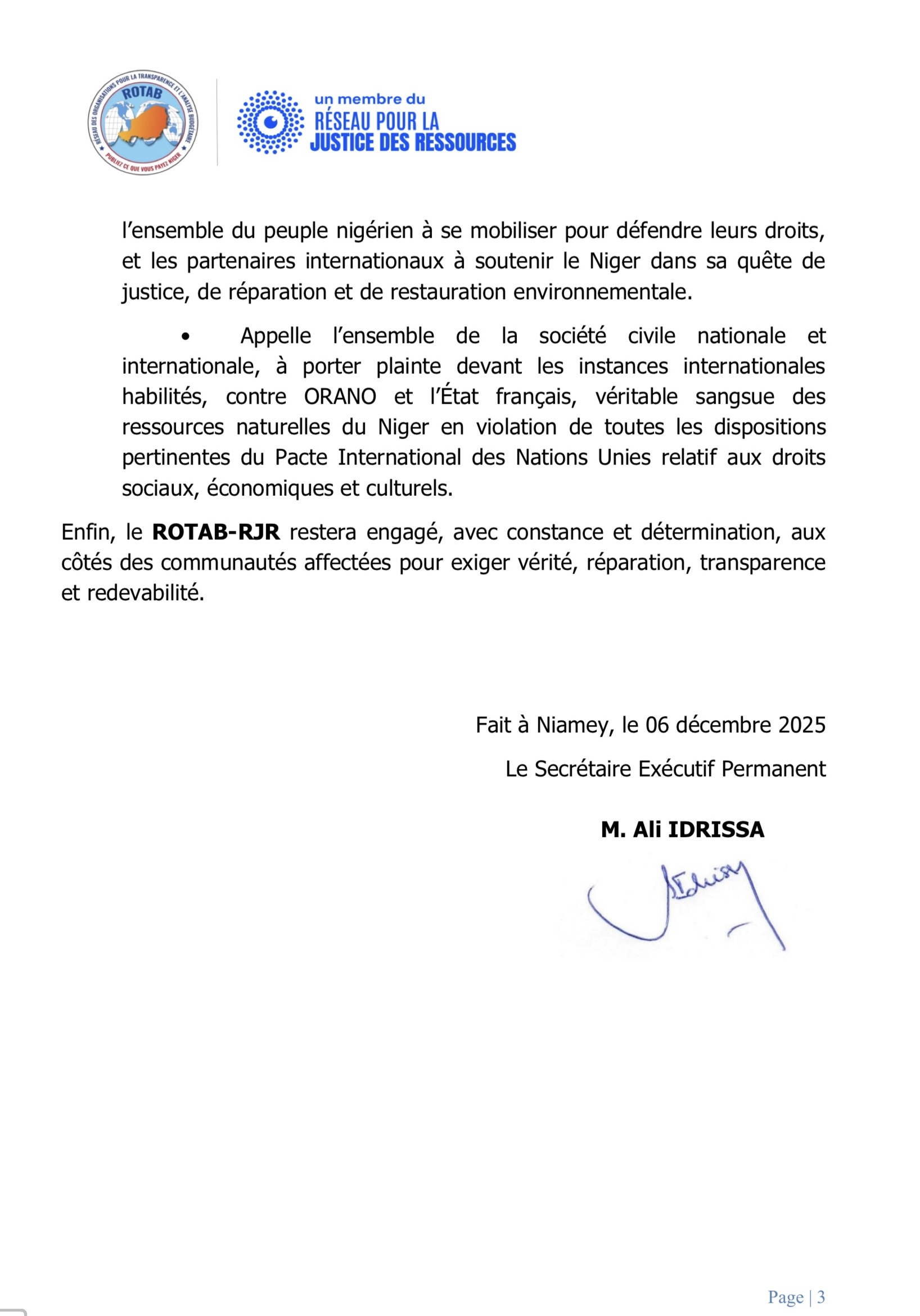 ​•​Appelle les autorités nigériennes à poursuivre ce combat avec fermeté et transparence, les organisations de la société civile et l’ensemble du peuple nigérien à se mobiliser pour défendre leurs droits, et les partenaires internationaux à soutenir le Niger dans sa quête de justice, de réparation et de restauration environnementale.